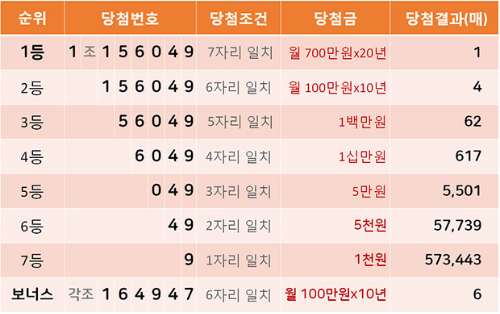 1등 당첨번호는 1조 1 5 6 0 4 9 였고, 보너스 번호는 1 6 4 9 4 7 이었습니다. 1등은 총 1매, 2등은 4매, 3등은 62매, 보너스는 6매가 당첨되었어요.