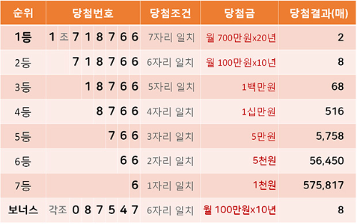 이번 회차에서는 1등이 2매, 2등이 8매, 3등이 68매 당첨되었고, 보너스는 8매가 당첨되었습니다. 1등의 경우, 매월 700만 원씩 20년 동안 연금식으로 지급되는 큰 혜택이 있습니다.