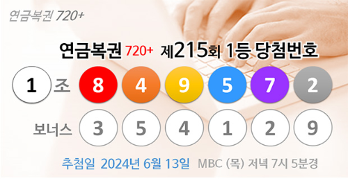 215회 연금복권 720+ 당첨번호는 2024년 6월 13일에 발표되었습니다. 1등 당첨번호는 '1조 849572'로, 2매가 당첨되었고, 보너스 번호는 '354129'로 5매가 당첨되었습니다.