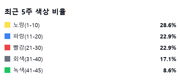 색상 비율을 봤을 때, 최근 5주간 노란색(1번대)이 28.6%로 가장 많이 나왔고, 녹색(41번대)이 8.6%로 가장 적게 나왔어요. 이번에는 녹색 번호의 출현 확률이 높아질 것 같아요.