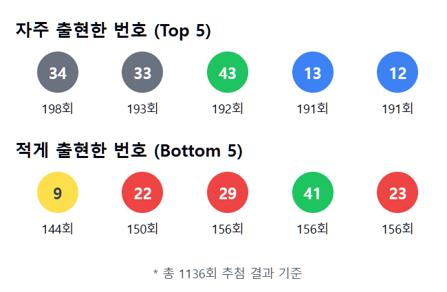 로또 645가 시작된 이후 지금까지, 총 1136회의 추첨이 이루어졌어요. 이 긴 역사 속에서 어떤 번호들이 자주 등장했고, 어떤 번호들이 조금 숨어있었는지 자세히 들여다보겠습니다.