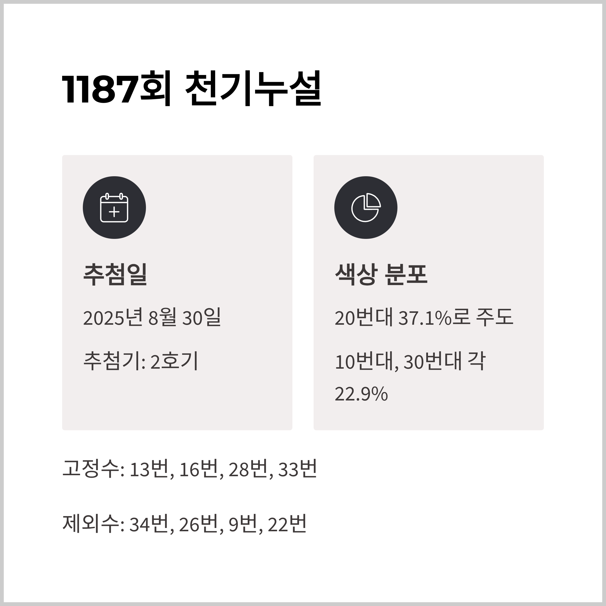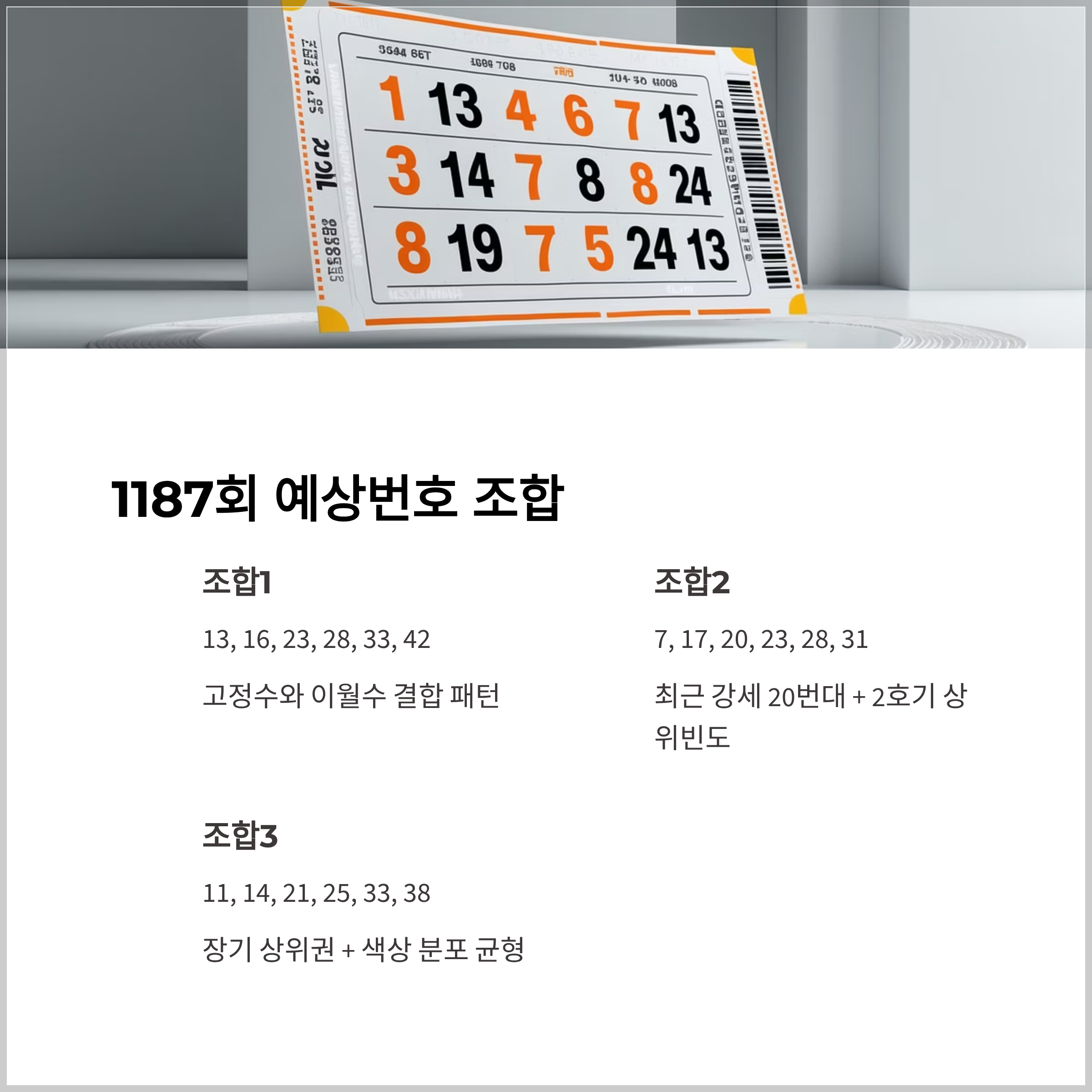 1187회는 최근 출현번호와 이월수의 결합이 중요한 회차입니다. 고정수로는 13, 16, 28, 33, 42가 유력하며, 제외수는 2, 22, 34, 35번이 적절합니다.