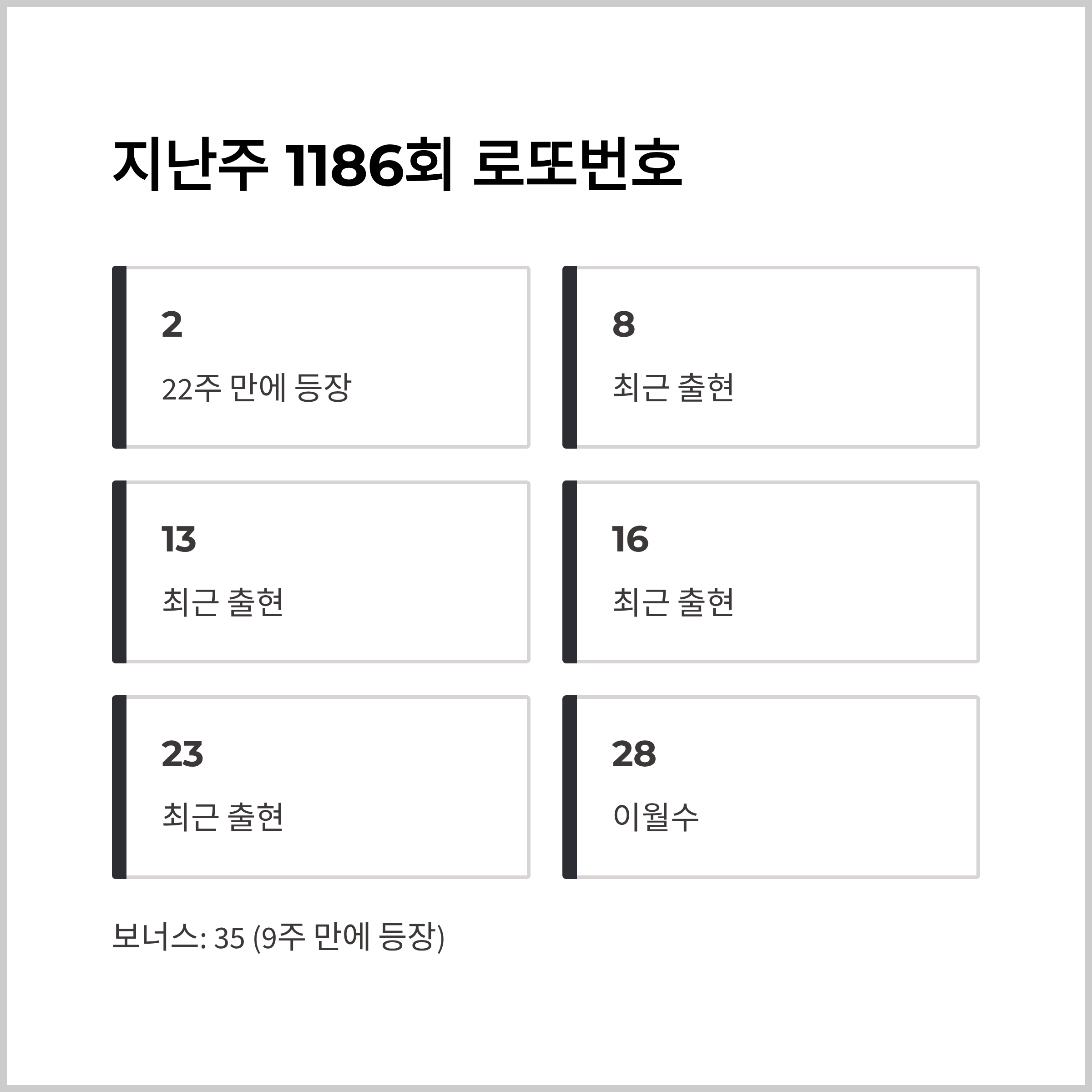 1186회 당첨번호는 2, 8, 13, 16, 23, 28, 보너스 35였습니다. 추첨일은 2025년 8월 23일, 사용된 추첨기는 2호기였습니다.
