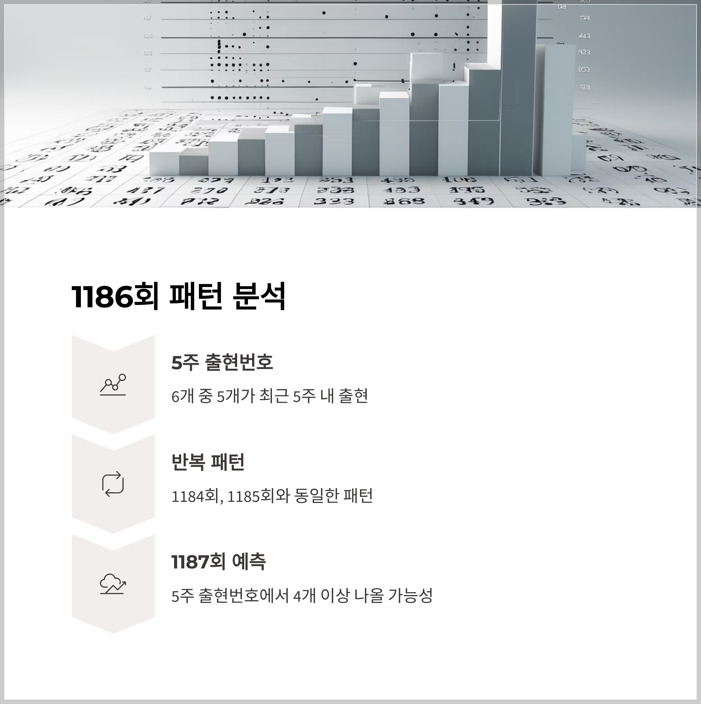 6개 당첨번호 중 5개가 최근 5주간 출현번호에서 나왔고, 나머지 2개는 미출현번호에서 선택되었습니다. 같은 패턴이 1184회와 1185회에서도 반복되었기 때문에, 1187회 역시 5주 출현번호에서 4개 이상이 나올 가능성이 큽니다.