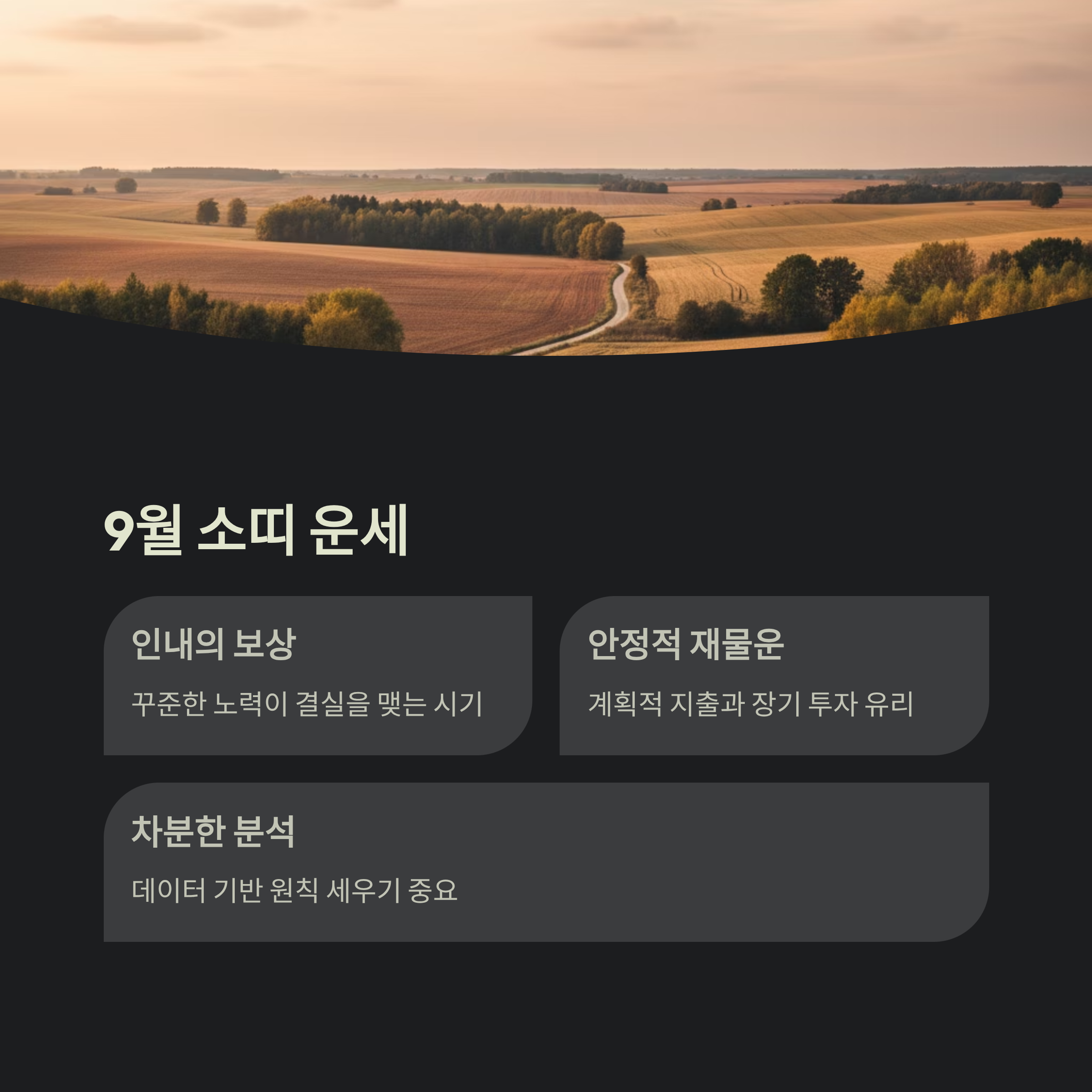 9월은 소띠에게 인내심을 갖고 꾸준히 노력해 온 것에 대한 보상이 주어지는 시기입니다. 예상치 못한 어려움이 있더라도 흔들리지 않고 묵묵히 자신의 길을 걸어간다면, 월말로 갈수록 점차 운이 트이며 만족스러운 결과를 얻게 될 것입니다.