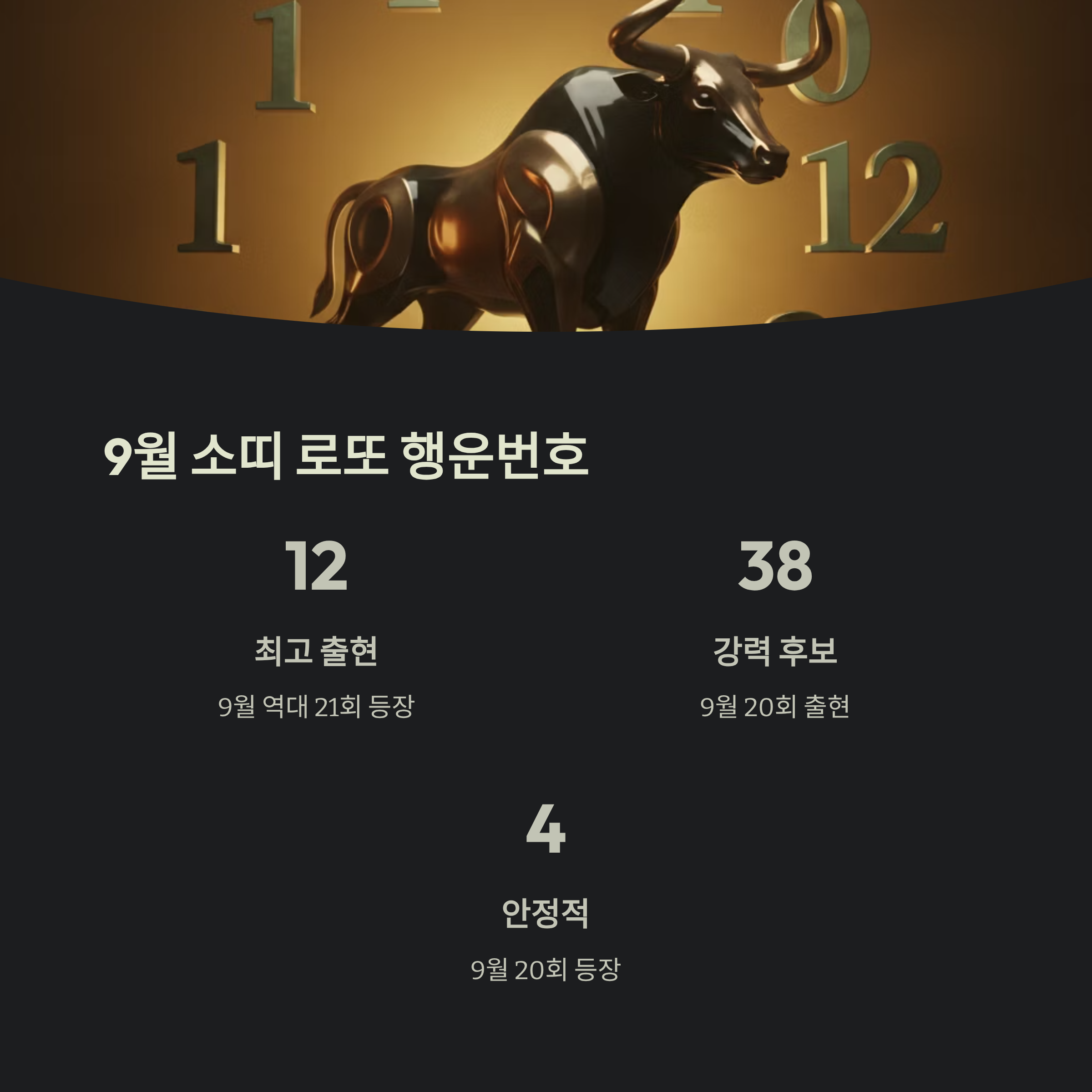 통계적으로 9월에 특히 강세를 보였던 번호들이 있습니다. 역대 9월 데이터를 살펴보면 12번이 총 21회 등장하며 가장 높은 출현 빈도를 보였고, 그 뒤를 이어 38번과 4번이 각각 20회씩 출현했습니다.