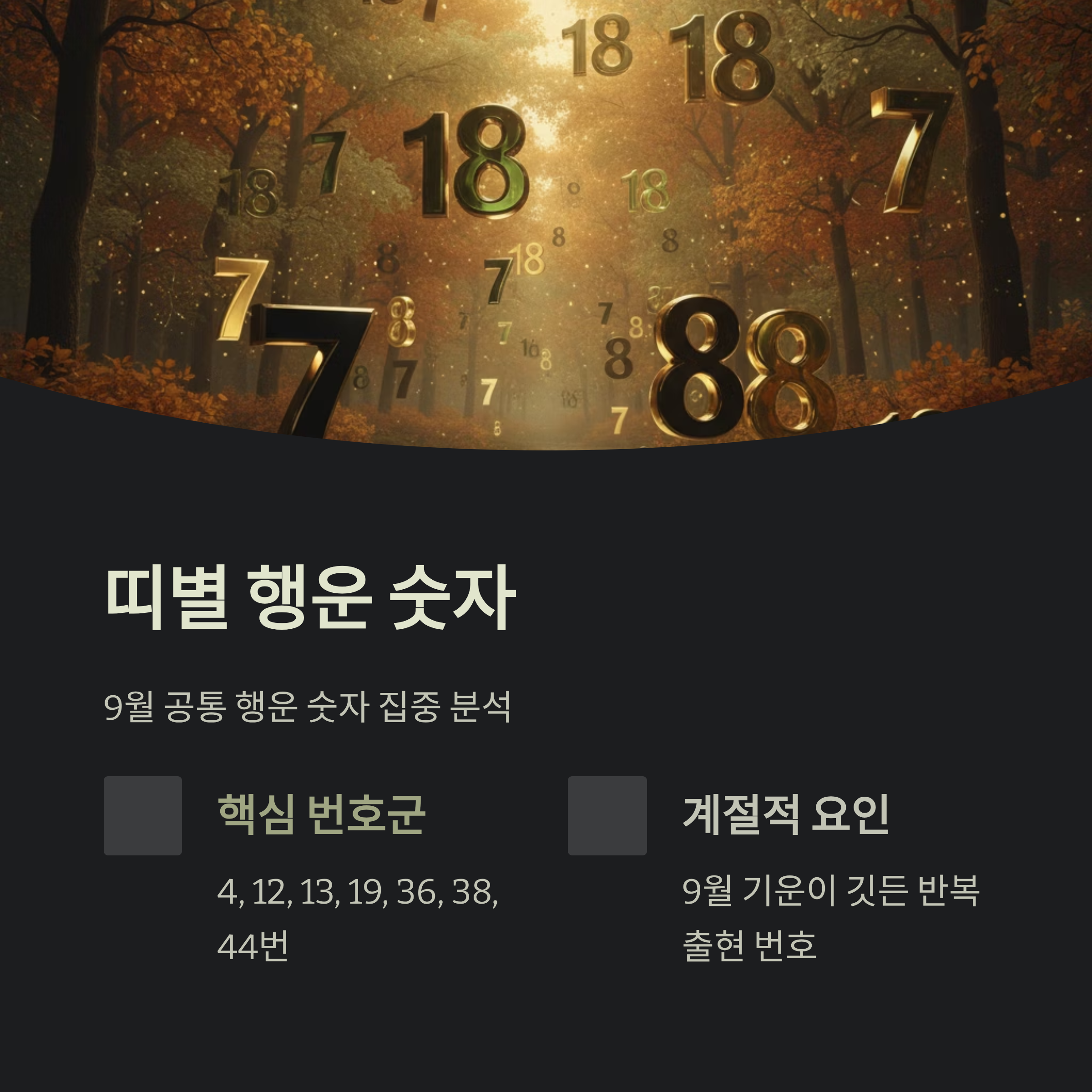 9월에는 특정 띠와 관계없이 4, 12, 13, 19, 36, 38, 44번 등이 강세를 보여왔습니다. 이 번호들은 9월이라는 계절적 요인과 맞물려 반복적으로 등장하는 경향이 있으므로, 이번 달에는 이 숫자들을 ‘공통의 행운 숫자’로 여기고 조합에 활용해 보시는 것을 추천합니다.