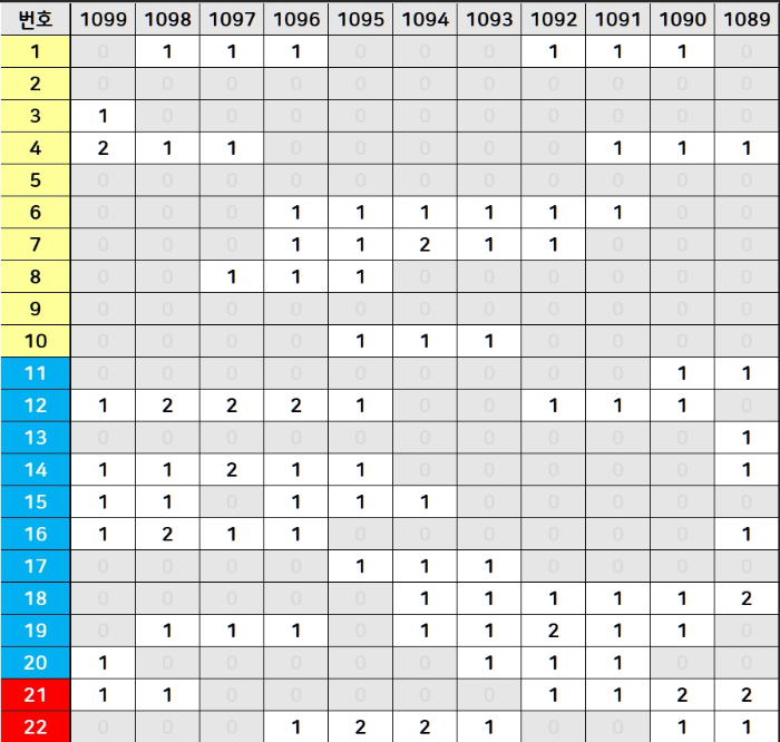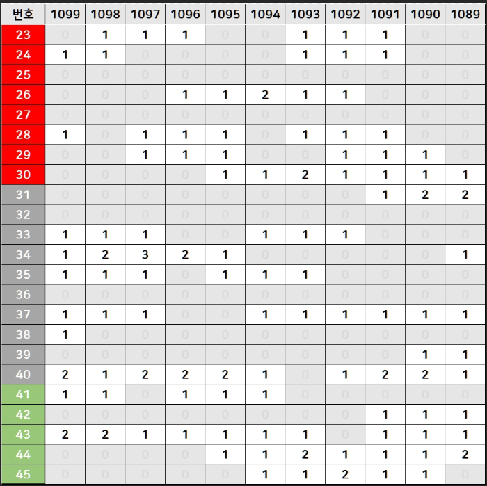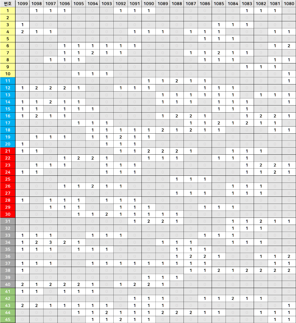 1100회 로또 번호를 찾는 일은 쉽지는 않지만 45개 로또번호와 회차별 당첨 빈도 흐름을 파악하면 좀 더 1100회 로또 1등 번호에 다가갈 수 있습니다. 분석표는 각 회차별로 3주간 당첨횟수를 표시하고 있습니다. 로또 1100회 당첨 예상번호를 분석 흐름에서 1101회 당첨번호 확정할 수 있습니다.
