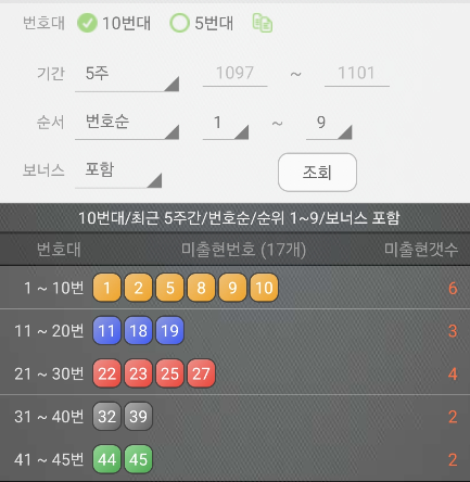 5주간 미출현 번호가 당첨확률이 높다고 하니, 아래 화면에서 17개 번호를 모두 분석할 수 있습니다.