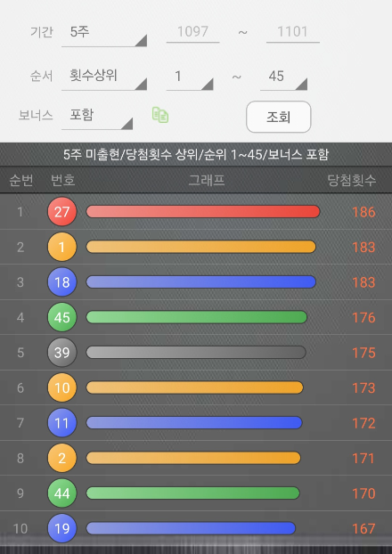 1097회 ~ 1101회 기간 동안 가장 많이 당첨된 번호를 파악할 수 있고, 가장 적게 나왔던 번호로 알 수 있습니다.